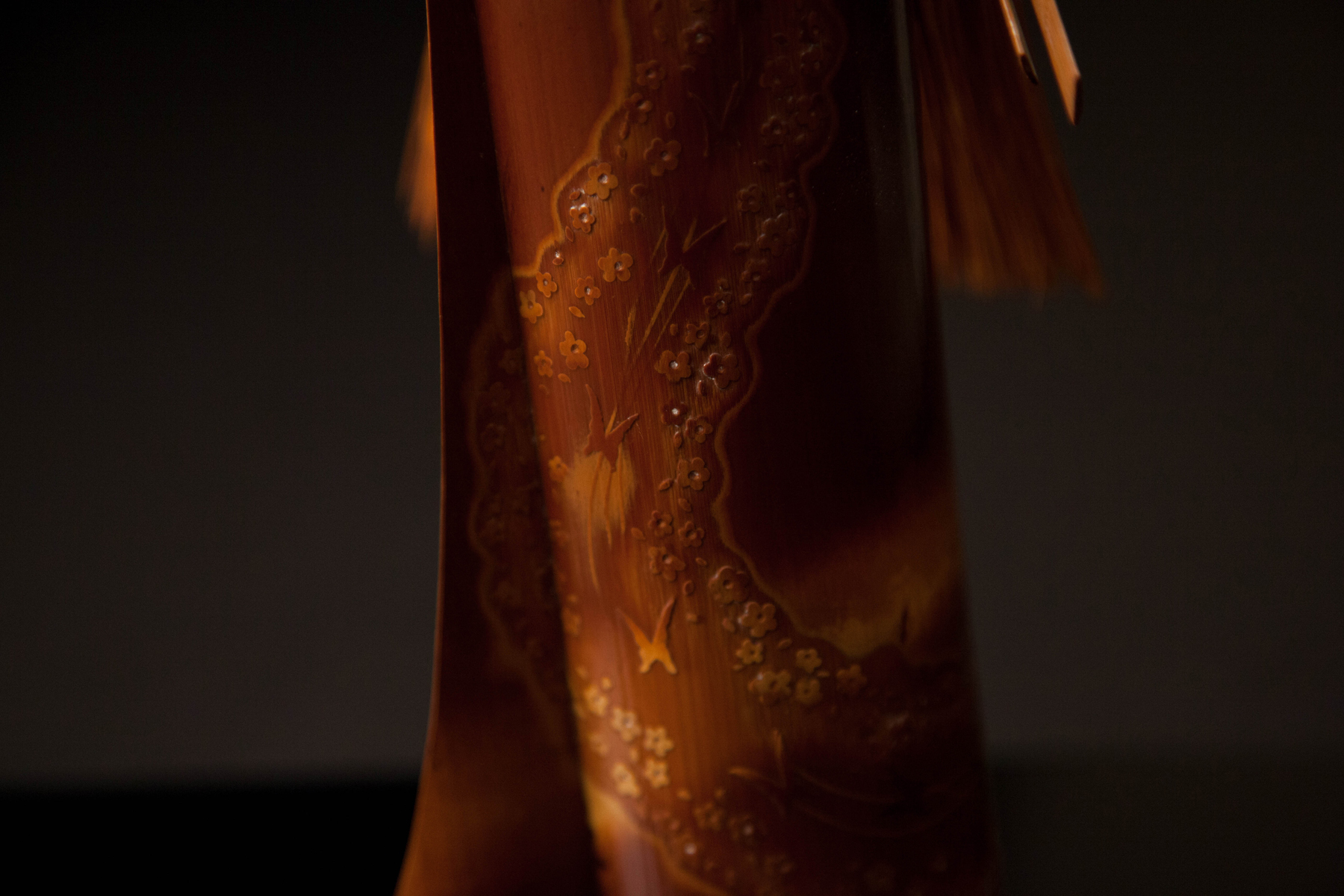 作家黎明が、手術のため外国に向かう機上の窓から、雲海に差し昇る日の出のおごそかな光を見て着想を得たのが「瑞光」です。「瑞光」とは、吉兆を表す光を意味します。裾模様には、天に向かって舞い上がる無限の「蝶」を彫刻し、生命力と命の大切さを表現しました。